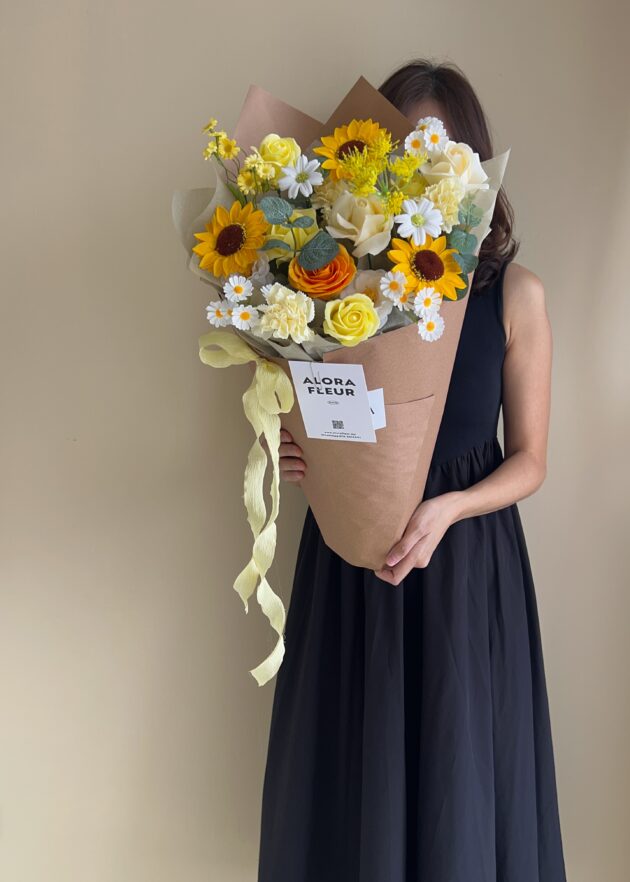 Dariel – Bright yellow sunflowers paired with cheerful orange and yellow blooms create a radiant and rustic arrangement in a playful ice cream cone design. Bursting with warmth and positivity, this bouquet is a joyful reminder of sunshine and happiness. Handcrafted from lasting soap petals, it’s perfect for congratulations, housewarmings, birthdays, or simply to send a little light into someone’s day.