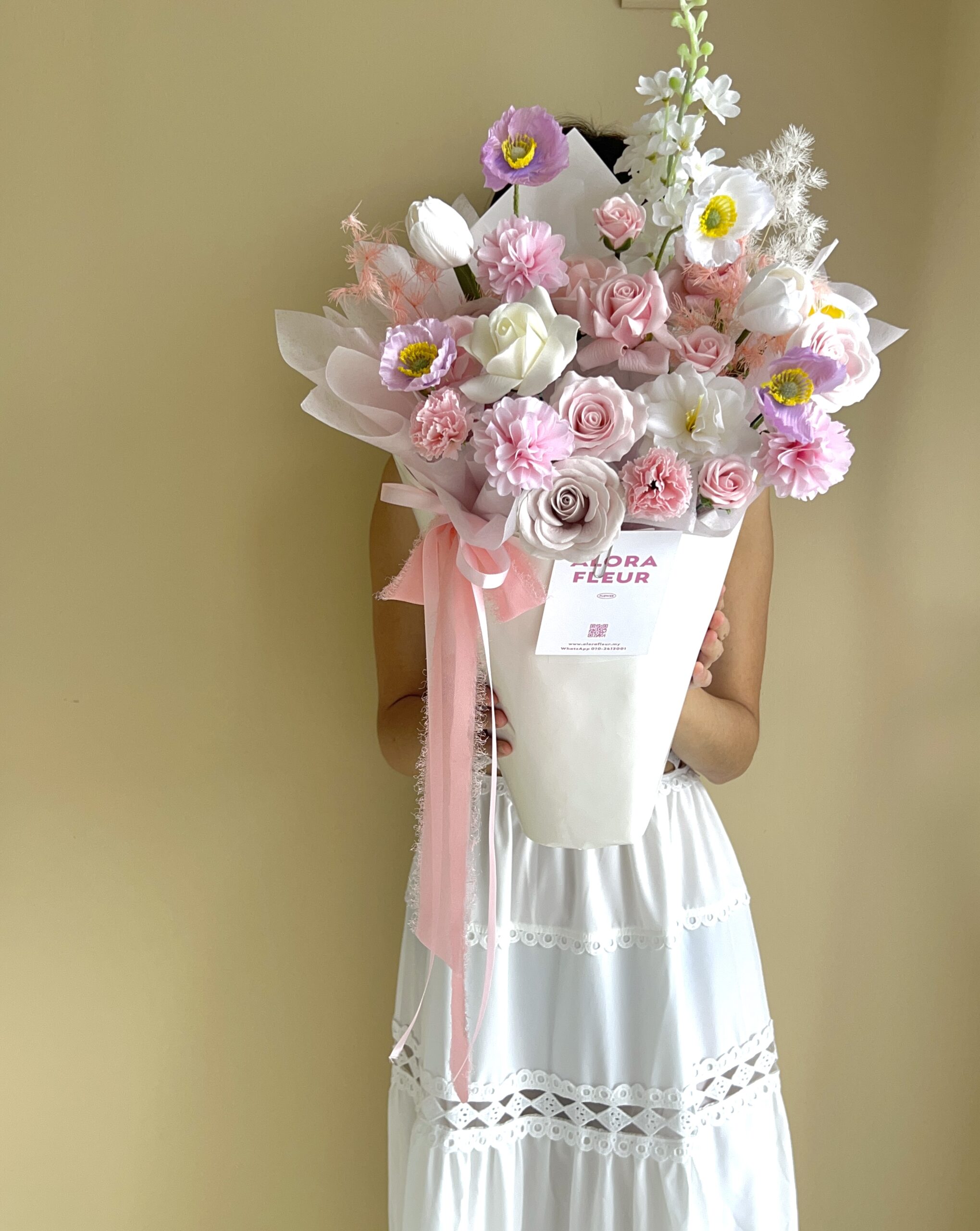 Playful yet refined, this charming arrangement combines soft white, delicate pink, and dreamy lilac blooms in a whimsical ice cream cone design. Handcrafted from premium soap petals, it’s a sweet way to gift elegance with a touch of fun. Perfect for birthdays, thank-you gestures, or simply to brighten someone’s day with a lasting treat.