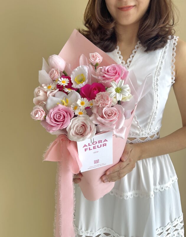 Mirelle – A graceful blend of white, soft blush, and deep pink blooms, this bouquet captures both tenderness and passion in one elegant design. Handcrafted from premium soap petals, it offers the beauty of fresh flowers with the gift of lasting charm — perfect for birthdays, anniversaries, any celebration of love, or just because.