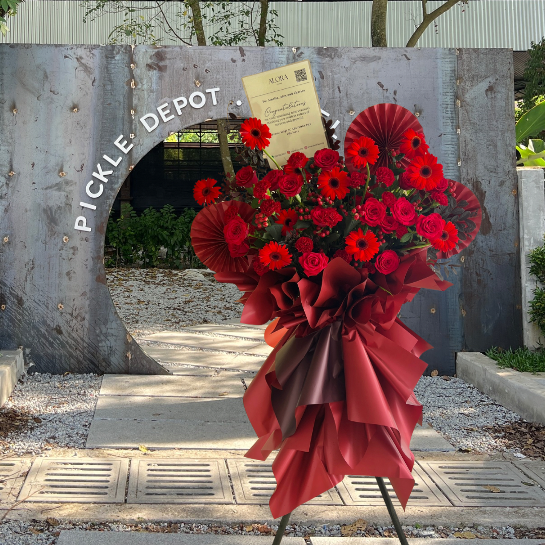 Features 6ft grand opening fresh flower stand with combination of red gerberas, roses, berries, foliages, carnation, red wood leaves.
