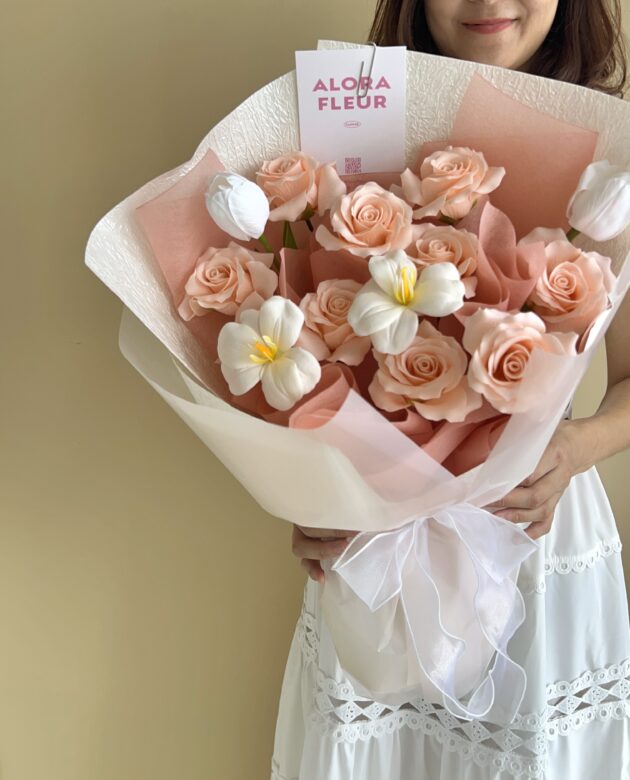 Verona – A graceful pairing of soft peach roses and pure white tulips, this bouquet radiates warmth, tenderness, and elegance. Handcrafted from high-quality soap petals, each bloom mirrors nature’s beauty while lasting far beyond fresh flowers. A timeless gift for love, gratitude, to apologize, or even for new beginnings and more!